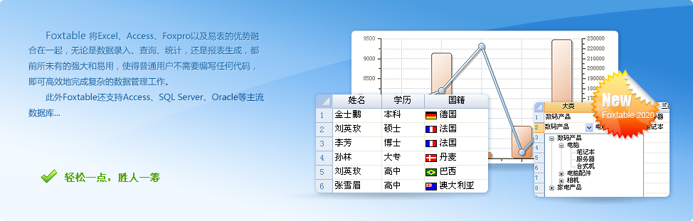 Foxtable將Excel、Access和Foxpro的優(yōu)勢融合在一起,并獨有層級數(shù)據(jù)管理功能,普通用戶不需要編寫任何代碼,即可完成各種復(fù)雜的數(shù)據(jù)管理工作,真正做到拿來即用。